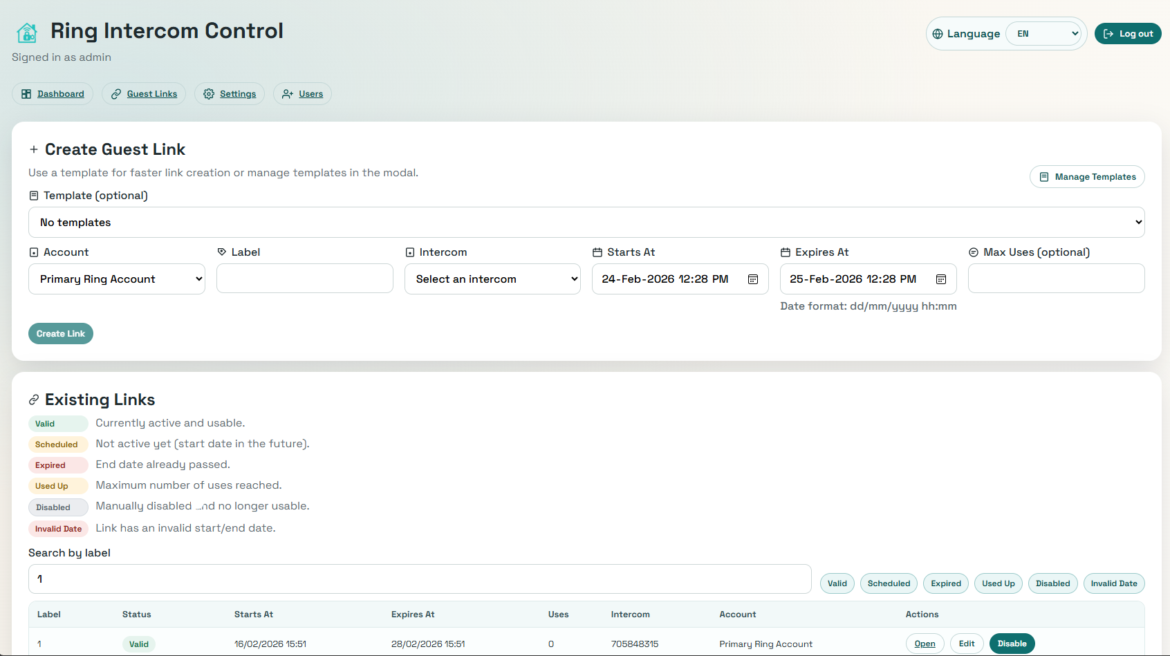 Secure Ring intercom management for B&B guest access, daily operations, and admin governance.